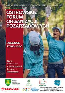 Burmistrz Miasta Ostrów Mazowiecka zaprasza przedstawicieli organizacji pozarządowych, Kół Gospodyń Wiejskich, Ochotniczych Straży Pożarnych, stowarzyszeń i fundacji z terenu powiatu ostrowskiego na Ostrowskie Forum Organizacji Pozarządowych. 26 listopada 2025 r. (środa)godz. 13.00Stara Elektrownia,...
