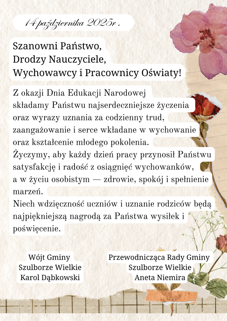 Z okazji Dnia Edukacji Narodowej składamy serdeczne podziękowania wszystkim Nauczycielom i Pracownikom Oświaty za codzienny trud, pasję i zaangażowanie w kształtowanie młodego pokolenia.