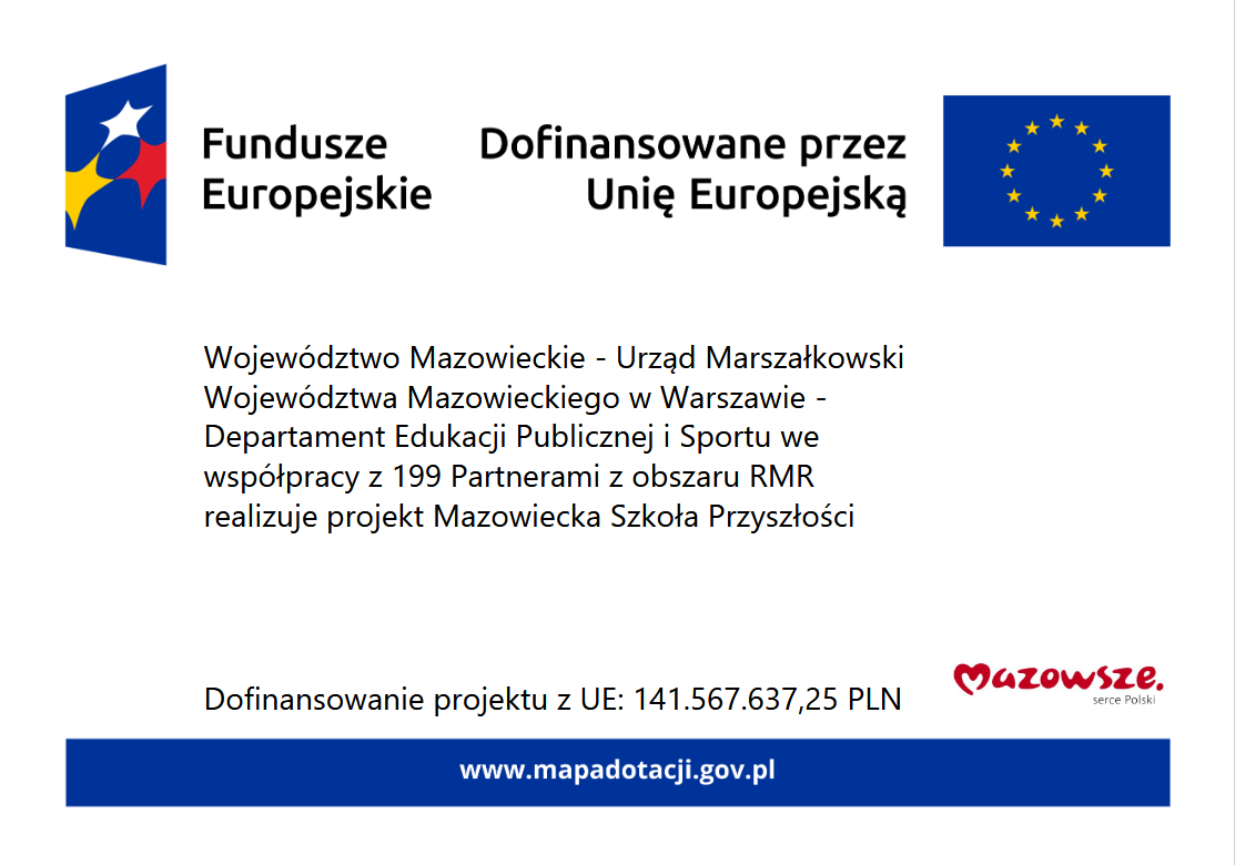 Projekt jest dofinansowany ze środków Unii Europejskiej w ramach Programu Fundusze Europejskie dla Mazowsza 2021-2027, Priorytet VII „Fundusze Europejskie dla nowoczesnej i dostępnej edukacji na Mazowszu”, Działanie 7.2 „Wzmocnienie kompetencji uczniów”.