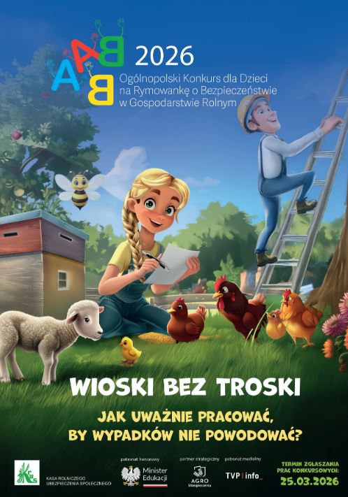 Kasa Rolniczego Ubezpieczenia Społecznego zaprasza dzieci do udziału w VII edycji Ogólnopolskiego Konkursu na Rymowankę o Bezpieczeństwie w Gospodarstwie Rolnym pod hasłem „Wioski bez troski”. Działanie zostało objęte Patronatem honorowym Ministra Edukacji Narodowej Barbary Nowackiej. Partnerem strategicznym wydarzenia są Agro Ubezpieczenia – Towarzystwo Ubezpieczeń Wzajemnych, a patronat medialny sprawuje TVP Info.